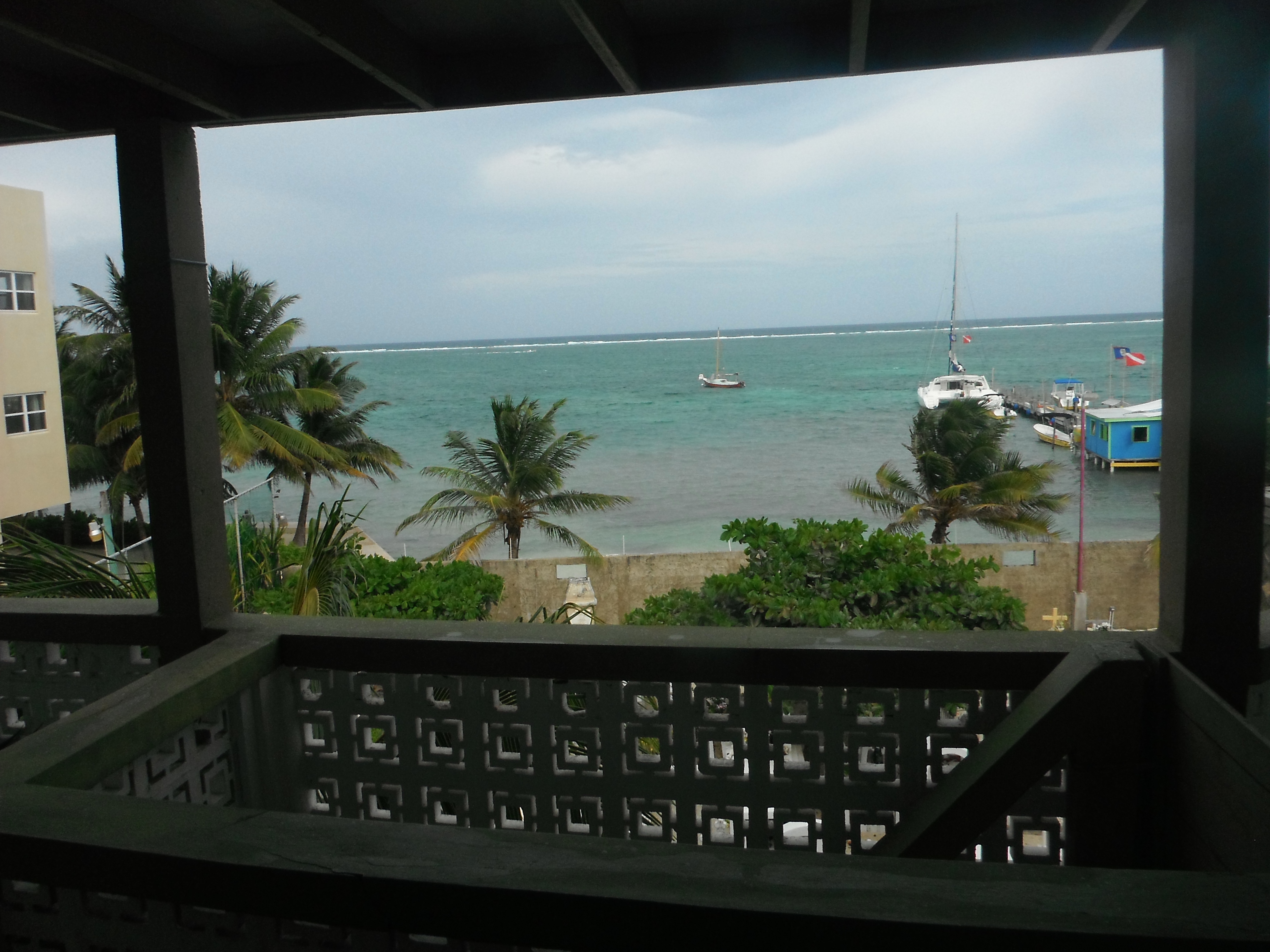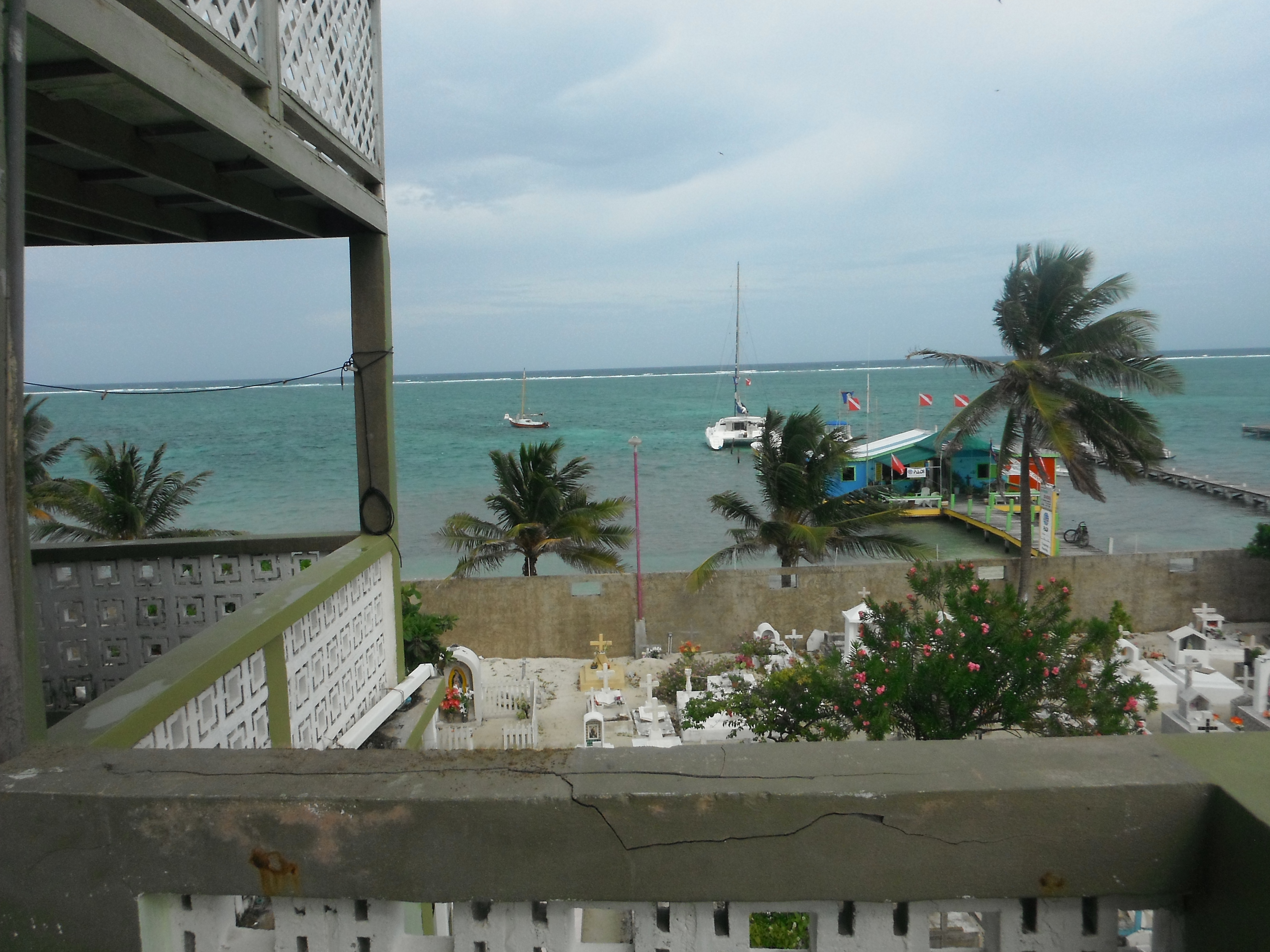 While on our way to Caye Caulker (with its approximate population of 600 people) we were required to stop on Ambergris Caye and switch boats. We weren’t interested in staying any longer than necessary as we generally gravitate towards rural peace and shy away from areas that are highly touristy but we were there so we figured we might as well look around. The water was the quintessential Caribbean aqua; the white sandy beaches were littered with dive centers, little restaurants, and shops. People were motoring around the streets in their golf carts (they are San Pedro’s main mode of transport). The town was alive with activity and energy. As we walked we started to feel that this crazy tourist mecca might be a better fit for Max. He would have the fun of being in a town with things to do and we were as close as possible to the barrier reef for snorkel and scuba fun which we will all enjoy. (hence the flocking of tourists) On a whim we stopped and enquired about apartments for rent in a nice building overlooking the sea but I figured if there were any they would be well out of our price range. Polo, the owner said there was one unit available and astonishingly it was affordable. As we started walking up the outside stairs to see it my heart started to quicken. I loved the look and the color, I loved the feel, I loved the old world cemetery that it overlooked, and I especially loved the view AND the high school is just around the corner. By the time we reached the third floor (there are four floors) and opened the apt. door, I could barely breathe. I loved it all. By Canadian standards it is run-down but by Belizean standards it is high-end. Before the end of the day we had paid the rent and gotten the keys. Being on an island has its disadvantages; the food is much more expensive, going anywhere else costs money for the water taxi but the advantages for us are worth it. We went ahead to Caye Cauker because we had already bought the ticket but didn’t stay long. It was quaint, lovely, still touristy just much much smaller. The half-hour boat ride back to Ambergris Caye was fast, bumpy, wet and serously adrenaline-pumping. It is the rainy season here now and the pilot was outrunning one of the frequent tropical storms that come up fast and furious. The next day we took the two hour water taxi back to Corozol to get our stuff. I will miss Corozol; its quiet streets and affable people where we have already made friends. We packed up and we arrived for good in our new home this afternoon. So here we are – living by the sea in the heart of the main tourist destination in all of Belize. Who knew! (Trying desperately again to get pics on but the glitch in my system may have to be sorted out again by my dear daughter Sabrina.)