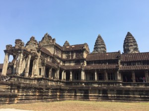 My first impression of Angkor Wat in Cambodia was its imposing grandeur. A large stone walkway crosses a 190 meter wide moat to the main entrance.