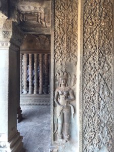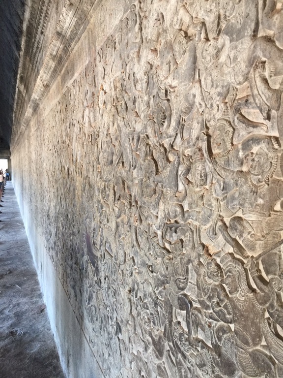 Stretching along the outside walls of the central temple are 800 plus meters of intricate bas-reliefs depicting stories of historical events and ancient mythology with exquisite detail. The most famous is called ‘The Churning of the Milk’ and depicts the Hindu story of creation where the devas (gods) and the asuris (demons) churned the ocean under the head of Vishnu to produce the divine elixir of immortality