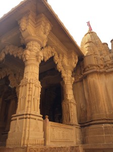 Jaisalmer (the golden city) is the quintessential desert town with golden sand coloured buildings and exquisite architecture. It looks like a scene right out of the Arabian Nights and we are loving it. In the heart of the town lies a massive sandstone fort surrounding a Jain temple full of intricate carvings that was built in the 12th century. The king allowed the families who worked for him to live within the fort and from that time on it has been passed down from generation to generation to the eldest son. Today, the descendants of those families are the only ones still allowed to live and sell their wares within the fort. Buying and selling the houses are not allowed as, technically, the king still owns the land. Our sandstone guest house ($9.00 a night) is within the fort walls and a stones throw from the temple. It all feels very exotic.