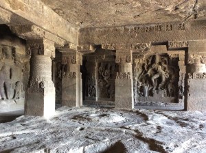 The Ellora Caves are a series of 34 caves, temples and monasteries carved out of pure basalt stone on the hillside in the area of Aurangabad. They represent a combination of Buddhist, Hindu and Jain faiths and imagining the work involved and how long it took to build them was simply too overwhelming to process. We would look at one small corner of one room, on one floor, of one cave, on one hillside, at one site (there are multiple sites) and marvel at the carvings. Trying to wrap our heads around the enormity of all of the caves was mind-boggling. But the Hindu temple, Kailash, is Ellora’s crowning glory, and to call it a ‘cave’ is a gross understatement. Like the other ‘caves’, it was hewn from pure stone and pictures could not begin to do it justice We happened to go to Elvira on a national holiday and it took a fertile imagination to envisage orange clad monks winding their way down the rough walkways (fortunately, we both have fertile imaginations). Nevertheless, we managed to find some quiet caves and basked in them. Overall, we have seen remarkably few non-Indian tourists so far.