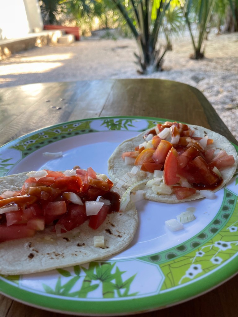 We have enjoyed some great street food. Unfortunately I forgot to take pictures. I’ll do better next post. I did remember to take a picture of our little homemade tacos. Fresh warm tortillas with chopped tomatoes, onion, cheese and doused with some delicious red Mexican blend of sauce. It wasn’t fancy but the freshness (and of course the sauce) sure made it yummmy.
