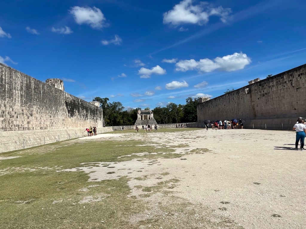 The ball field was a big stone court with a very small stone opening on each side and felt like a quidditch court. The Mayan ball game was a celebration that recreated how the holy twins defeated the nine evil Gods of the underworld. (A brief history – the twins won challenges against the evil Gods with the ball game being the final challenge. Soon after the twins were victorious they were transformed into the sun and the moon. As a reward for this great deed the Gods released the souls of 400 of their ancestors and they were transformed into stars. So it’s thanks to the twins victory that the world exists as we know it today :)). The Mayans created several ball courts in every city but the only one that was used for ceremonial purposes was Chichen Itza, the largest one. Each team of seven players prepared themselves in advance to be worthy by fasting and sauna and other interesting rituals for days. The game lasted several days and the first team to score a point was the winner. To score the point a six pound rubber ball was put through a small hole high on the wall. The trick was only the shoulders, head and hips could be used – hands and feet were not allowed. The game ended with the captain of one team holding the severed head of the opposing captain. They are still not sure which captain was sacrificed – the winner or the loser. Some say the losers but since being a gift to the gods was a great honour it’s also believed that only the winner was worthy of the sacrifice. Honour or not, I think I’d pass on being a captain.